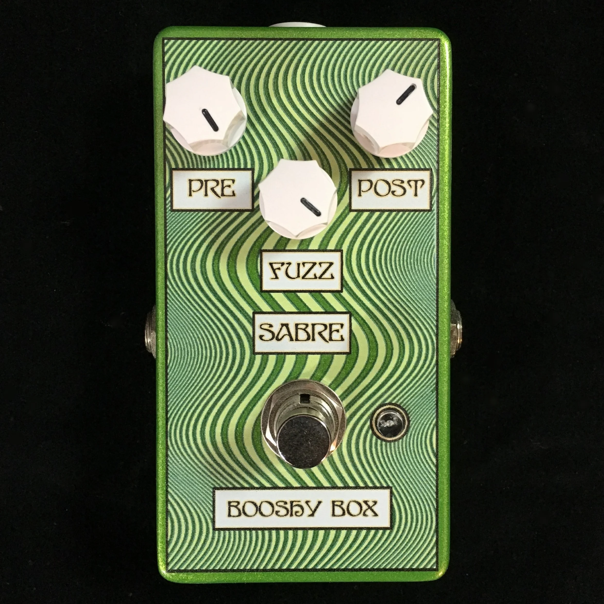The Sabre is a burly sounding, tonebender-type circuit made with silicon transistors, selected for gain and tuned by ear. In addition, blend-able clipping diodes (the FUZZ knob,) provide a textural control of the pedal's sound. As the FUZZ knob is engaged, the clipping diodes compress and smooth out the fuzztones. Bring up the POST to make up gain (there's plenty in reserve!) It produces soaring lead tones and chunky chords for rhythm work. The Sabre is a musical pedal and designed to maintain note definition within the fuzz storm. There are several sweet spots with differing characteristics along the pedal's spectrum. Sabre is excellent on bass as it holds together the low end incredibly well.